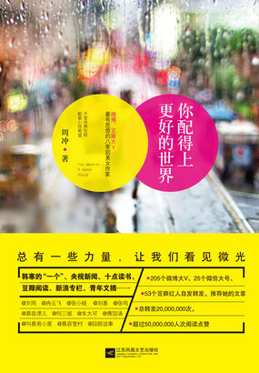 《你配得上更好的世界》是周冲第一部随笔集。此书以两性关系、世事、人性、电影、书籍等为话题,或嘻笑怒骂,或悲悯关怀,或尖锐剖析,直面这个世界的荒诞、痼疾与沉疴。她的文字幽默、华美、深刻、灵气逼人,才华如花亦如刀,同时兼具深度、高度,和温度,所著作品有着浓郁的个人特色。一如众多名家所评价的,这本书的阅读快感、美学享受和思想撞击,都远远超出预期,让人手不释卷。